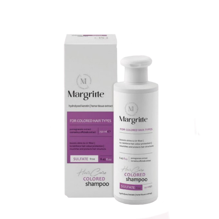 شامپو مخصوص موهای رنگ شده مارگریت حاوی جاذب های اشعه ماورای بنفش نور خورشید، کراتین هیدرولیز شده و عصاره انار ، رنگ موها را تثبیت نموده و باعث تداوم رنگ موها به مدت طولانی شده و سبب محافظت و تقویت ساختار موها میگردد. این محصول با ایجاد لایه محافظ بر روی تار مو ضمن ترمیم اثرات مخرب رنگ مو، موجب درخشندگی و زیبایی موها می شود.