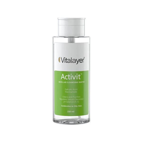 میسلار واتر اکتی ویت ویتالیر (Vitalayer) پاک کننده ملایم منافذ پوست جهت استفاده روزانه است و گزینهای عالی برای جلوگیری از ایجاد آکنه در افرادی با پوست چرب یا مختلط است که اثربخشی آن توسط متخصصین پوست تایید شده است.این میسلار واتر حاوی آب دیونیزه است که علاوه بر رطوبت رسانی باعث لایه برداری و تنظیم چربی و رفع آلودگیهای سطح پوست می شود و با خاصیت مات کنندگی خود برق ناخوشایند پوست را می گیرد.در کنار این ماده اثربخش،نیاسینامید نیز در بین ترکیبات این میسلار واتر به چشم می خورد.این ماده نیز خاصیت آبرسانی دارد و موجب بهبود شفافیت پوست صورت میشود.پاککننده میسلار واتر اکتیویت کمپانی ویتالیر حاوی مقادیر زیادی سالیسیلیک اسید است. این اسید خاصیت ضدالتهابی دارد و مانع از بروز جوش میشود.از طرفی سالیسیلیک اسید یک لایهبردار قدرتمند است و به زیبایی و سلامت پوست صورت نیز کمک می کند.وجود بیوتین در این محصول نیز باعث از بین رفتن جوشها و همچنین محو شدن لکههای پوستی میشود.عدم استفاده از الکل و مواد حساسیتزا موجب شده تا بسیاری افراد بدون هیچ دغدغهای بتوانند از میسلار واتر اکتیویت ویتالیر استفاده کنند.
