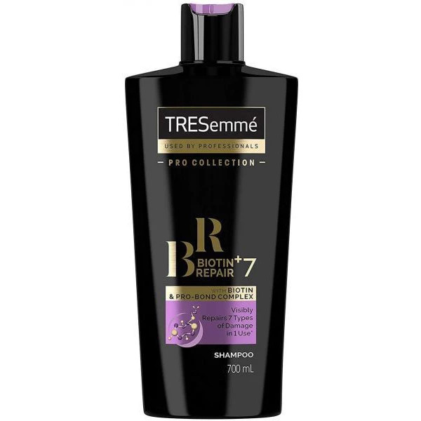 شامپو ترمیم کننده بیوتین ریپیر ۷ کاره ترزمه (Tresemme Biotin Repair 7 Shampoo) ضد ریزش، تقویت کننده و ترمیم کننده از برند ترزمه است. این محصول حاوی بیوتین و کمپلکس Pro-Bond است. در واقع بیوتین یک کوآنزیم است که به تولید و فعالسازی آنزیمها کمک میکند. از آنجایی که تارهای مو از پروتئینی به نام کراتین ساخته شدهاند، شامپو بیوتین ترزمه که حاوی بیوتین است نقش موثری در رشد و افزایش ضخامت موها دارد و باعث رفع ریزش مو و رشد مجدد آن میشود. با افزایش ضخامت و تقویت ریشه تارهای مو به کمک بیوتین موجود در این شامپو به طرز چشمگیری ریزش مو کاهش پیدا میکند. قدرت تاثیرگذاری این شامپو بسیار سریع بوده و از اولین استفاده تاثیرات آن را خواهید دید.